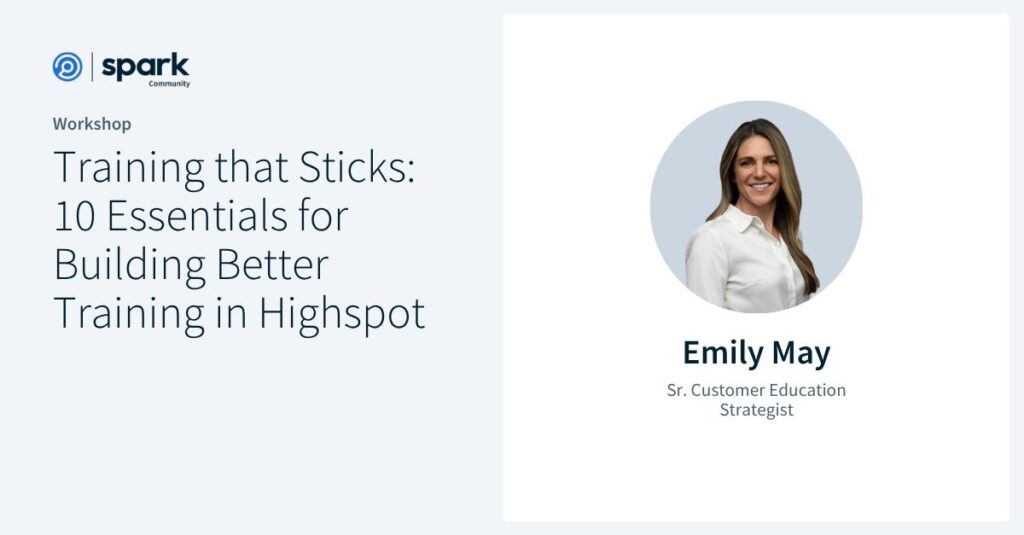 Back by popular demand from Spark ’25, this live, interactive virtual workshop brings the in-person experience to you online. Join fellow Highspot customers to collaborate on best practices for designing training that truly sticks. You’ll get hands-on with Highspot to create impactful learning experiences that prioritize engagement and real-world application.